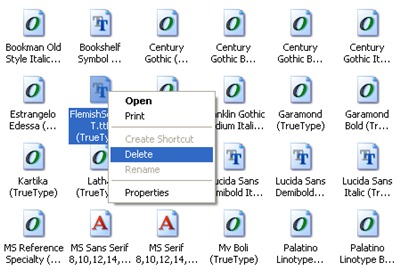 Tại đây bạn hãy tìm đến những Fonts chữ không cần thiết và thực hiện xóa Fonts chữ như khi thao tác xóa 1 file nào đó trên máy tính: Bấm chuột phải vào (những) Fonts chữ muốn xóa, sau đó chọn Delete, chọn tiếp YES.
